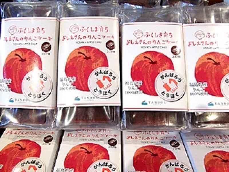 「福島育ち よしえさんのりんごケーキ」 ¥500 福島県産のりんごをたっぷり使用してソフトに焼き上げたパウンドケーキです。 ココアとシナモンがりんごの美味しさを引き立てます。