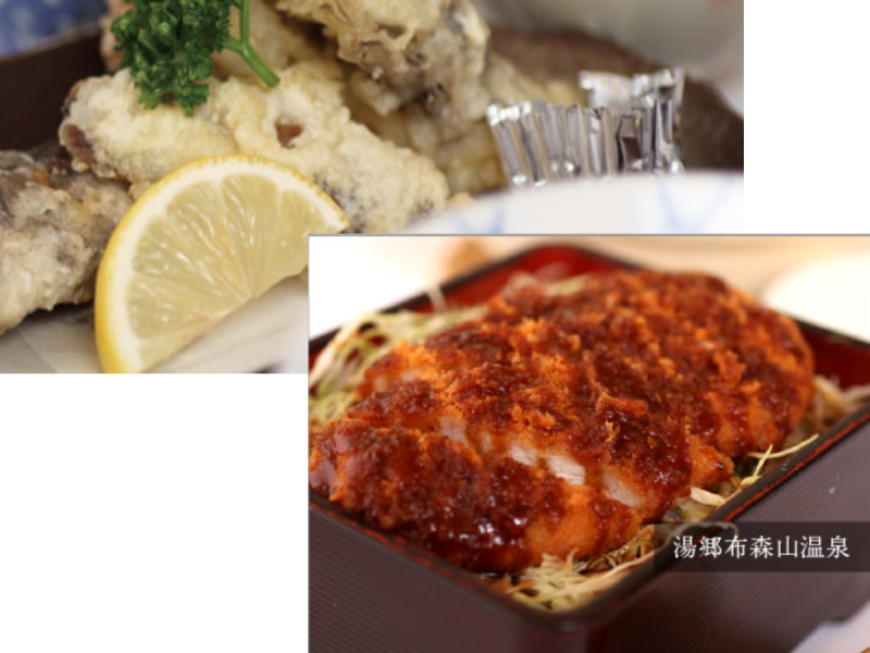 湯郷布森山温泉のお料理。 一風呂浴びた後は、山あいの里ならではの食材を使った自慢のメニューをどうぞ。