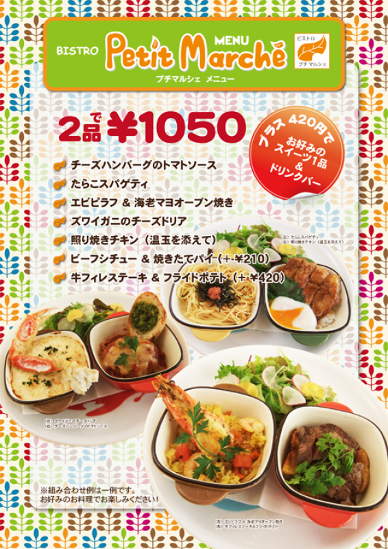 基本のメニューです。 2品選んで1,050円~(お選びいただくメニューによって変わります。)