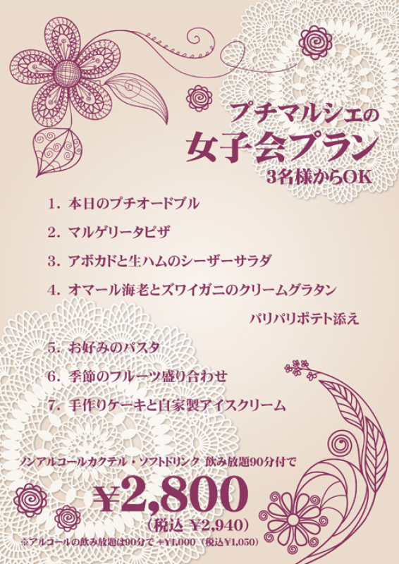 パーティプラン:女子会プランです 3名様以上!ご予約ください