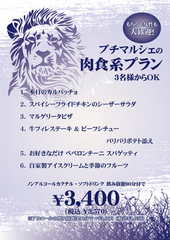パーティプラン:肉食系プランです 3名様以上!ご予約ください