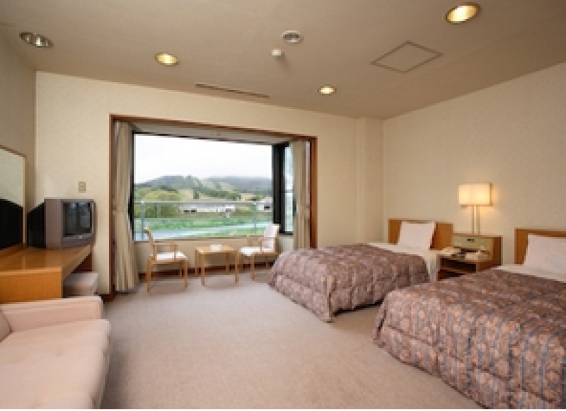 東館 最上階の洋室【デラックス】ツインルーム 最上階の6階にありお部屋より磐梯山、お部屋前の廊下からは猪苗代湖と猪苗代の街並み(夜景)を望む絶景を楽しめます。約25平方メートル。